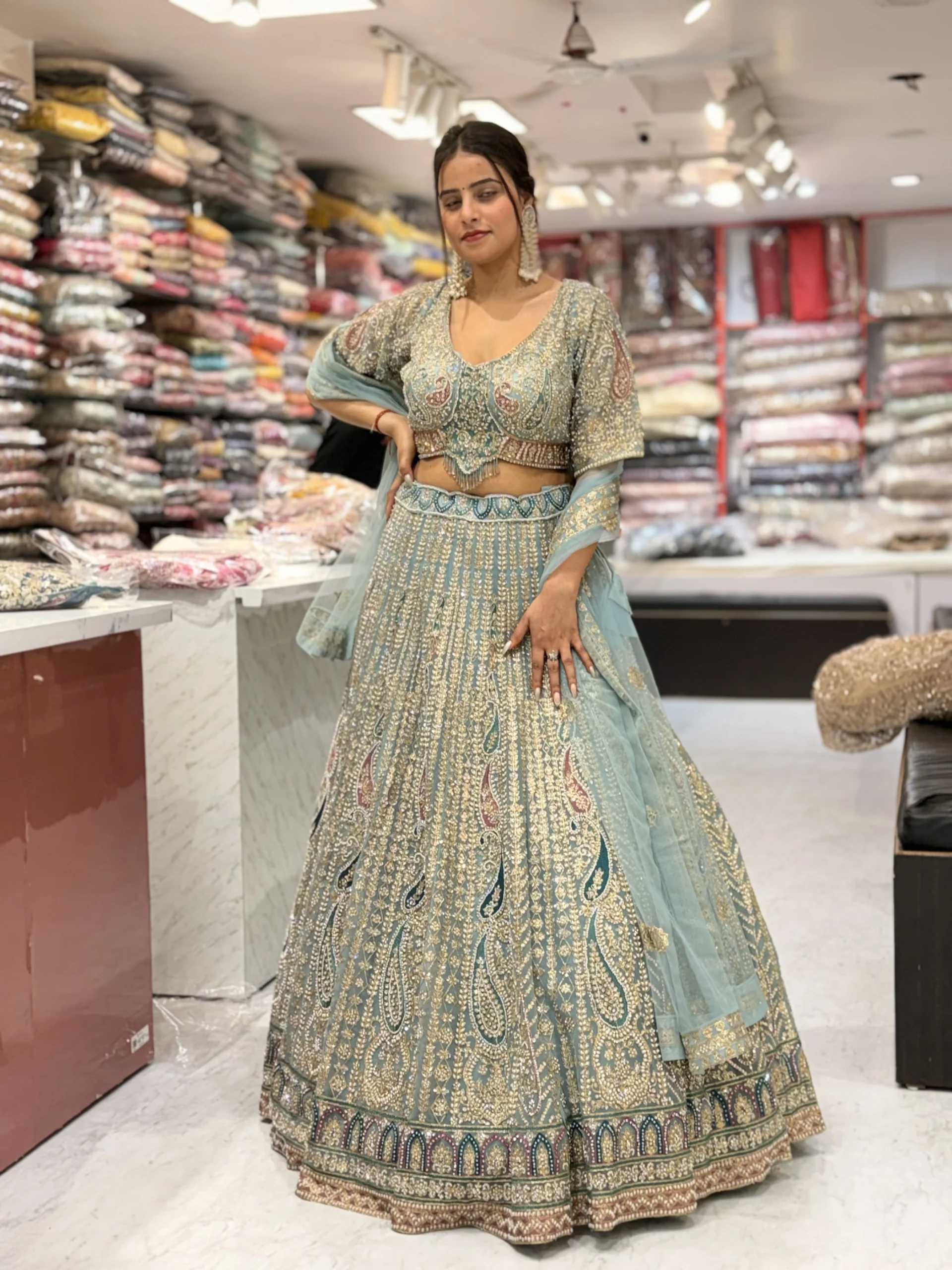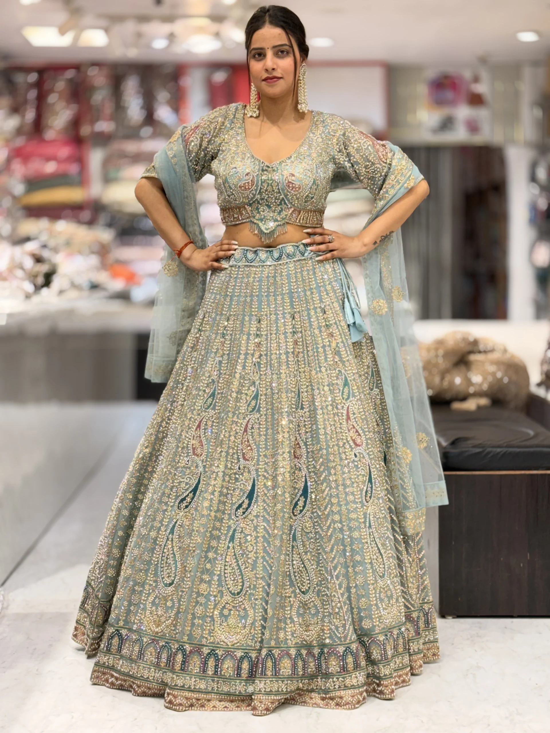 Make a graceful statement with this stunning sage green embroidered lehenga set. Adorned with intricate zari and sequin detailing, the ensemble features a beautifully crafted blouse paired with a flowy, heavily embellished skirt and a soft net dupatta. Designed to blend tradition with elegance, this outfit is perfect for weddings, receptions, and grand festive celebrations.