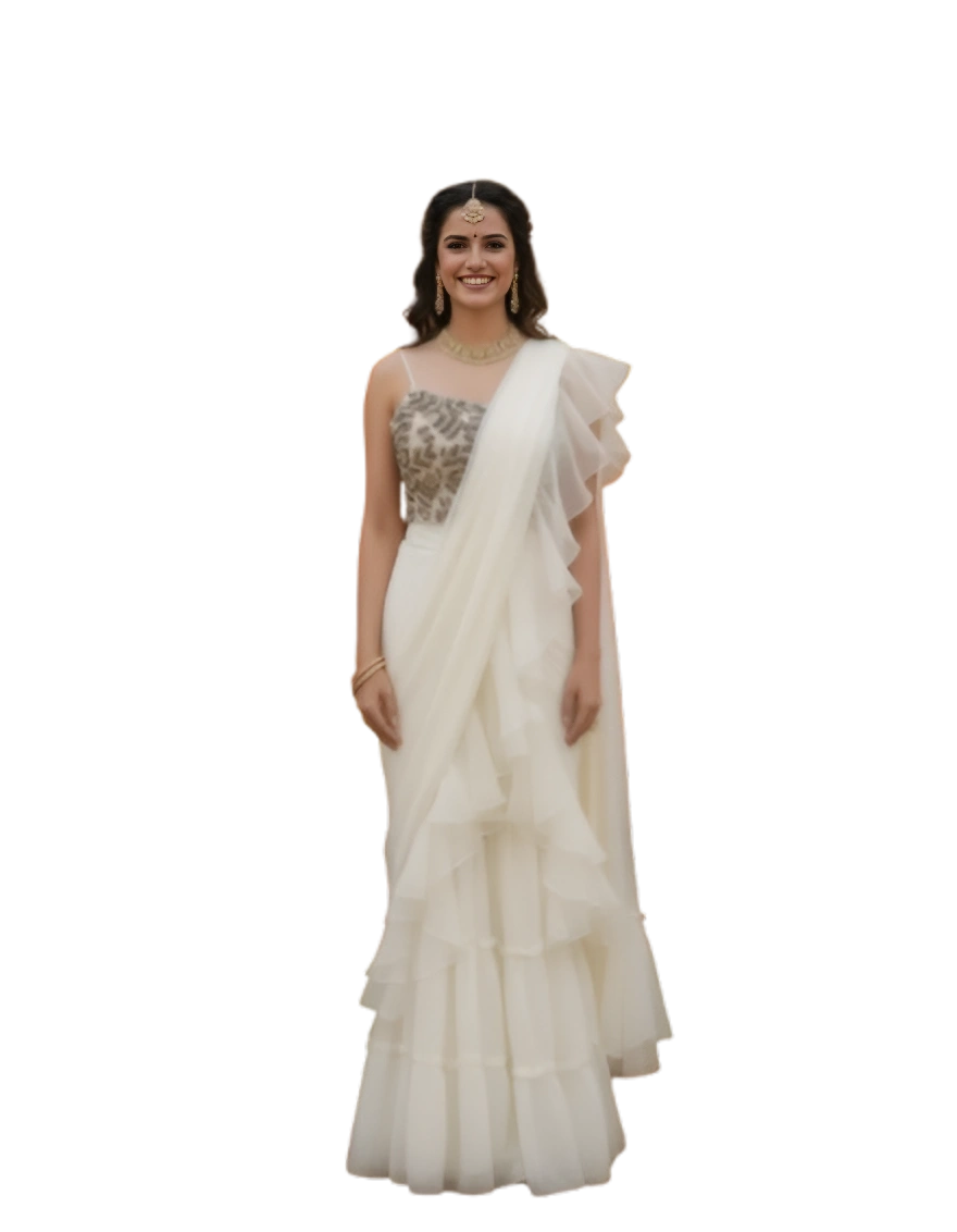 The cascading ruffles create graceful movement and a flattering silhouette, making it a standout choice for festive celebrations, weddings, cocktail parties, and special occasions. Designed to blend cultural heritage with trend-forward elegance, this saree ensures you look effortlessly chic while embracing timeless tradition.