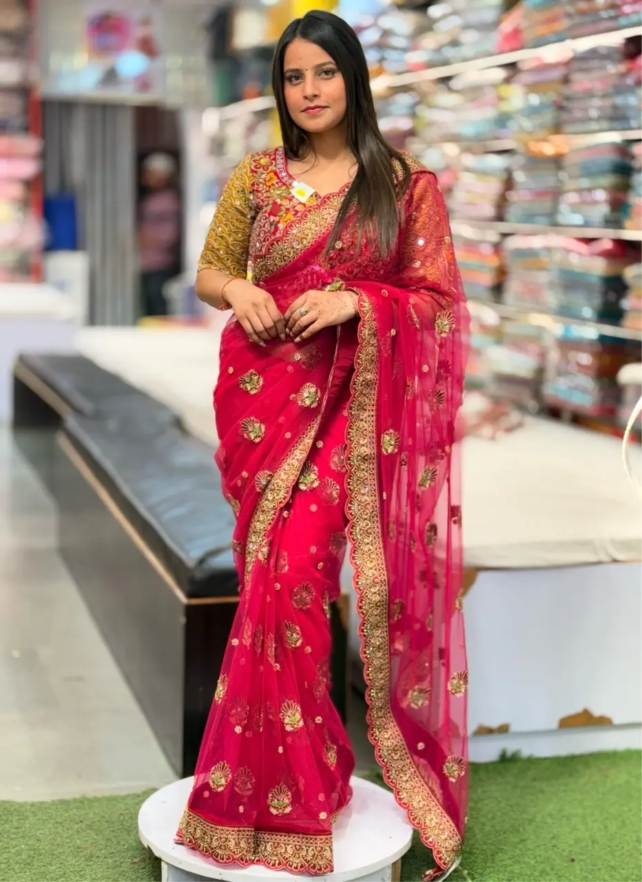 The vibrant color symbolizes festivity and elegance, while the detailed craftsmanship enhances its luxurious appeal. Designed to drape gracefully and flatter your silhouette, this saree is perfect for weddings, receptions, festive gatherings, and grand cultural occasions.