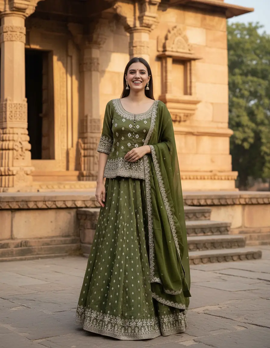 Our festive lehenga collection celebrates heritage artistry with modern refinement. Each piece is thoughtfully crafted with detailed embroidery, premium fabrics, and elegant silhouettes to ensure you shine with confidence at every special occasion.