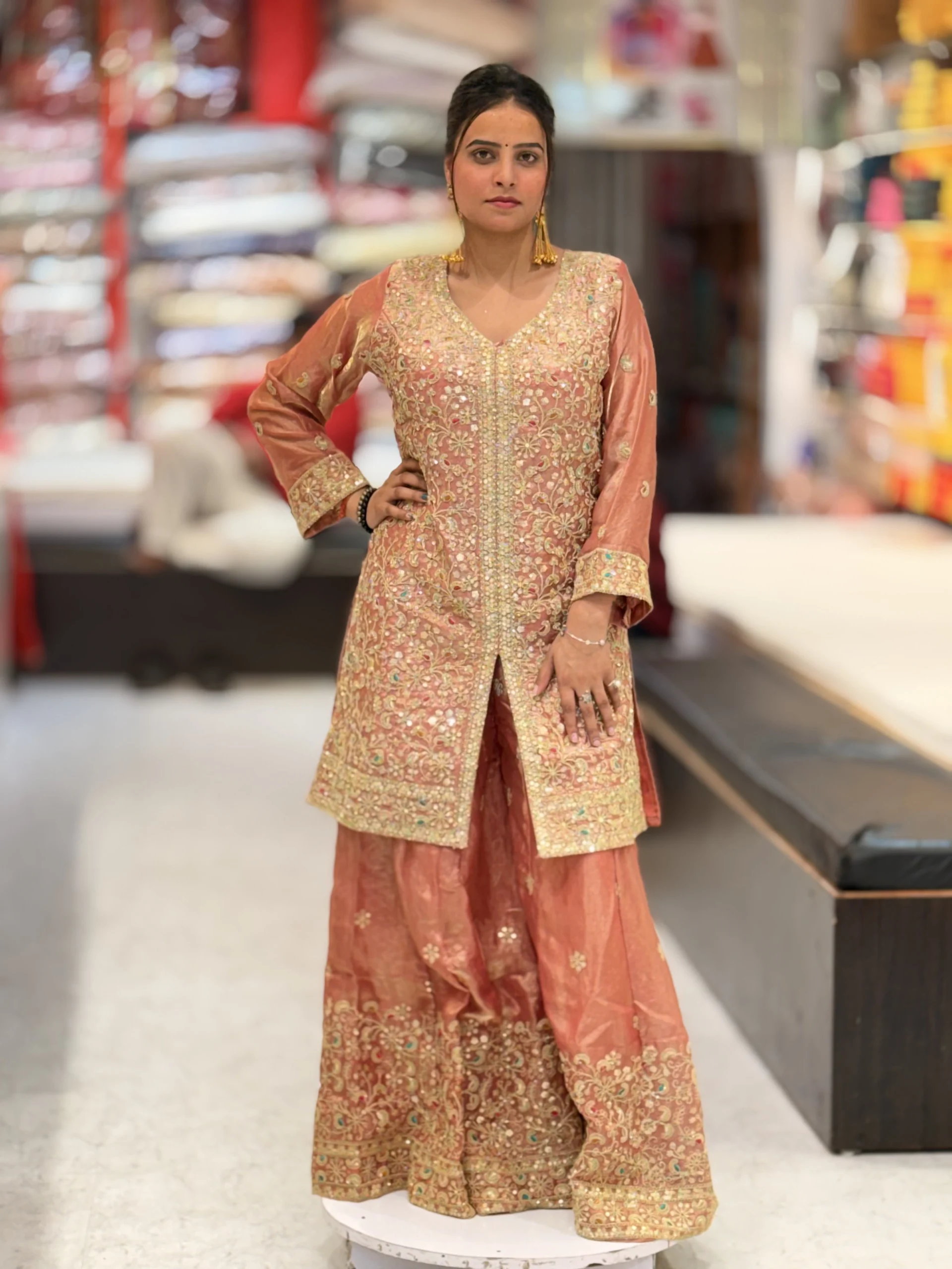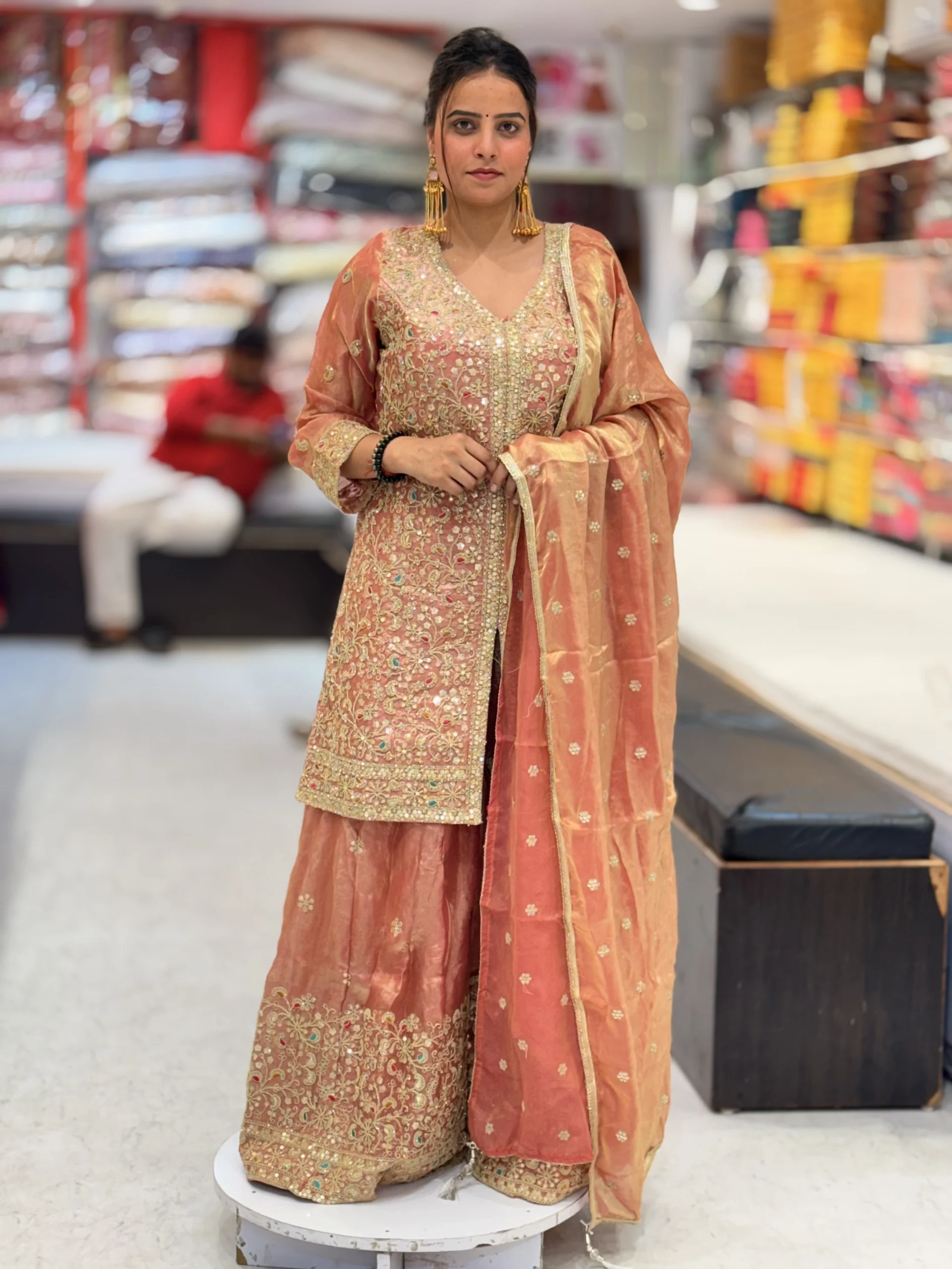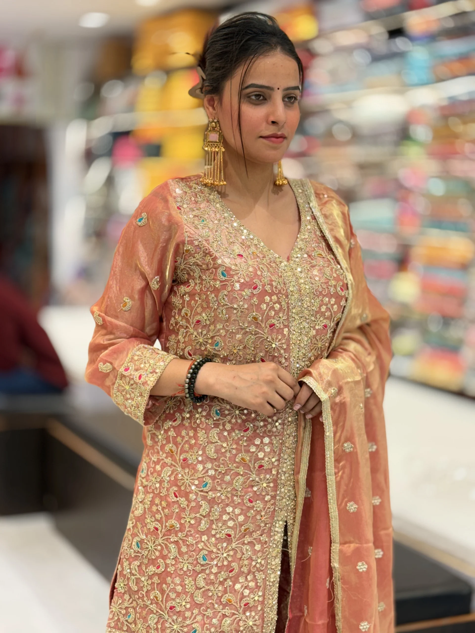 Brighten every celebration with the radiant charm of the Peach Embellished Suit. Designed in a soft peach hue, this stunning ensemble features exquisite embellishments that add richness, sparkle, and festive elegance.