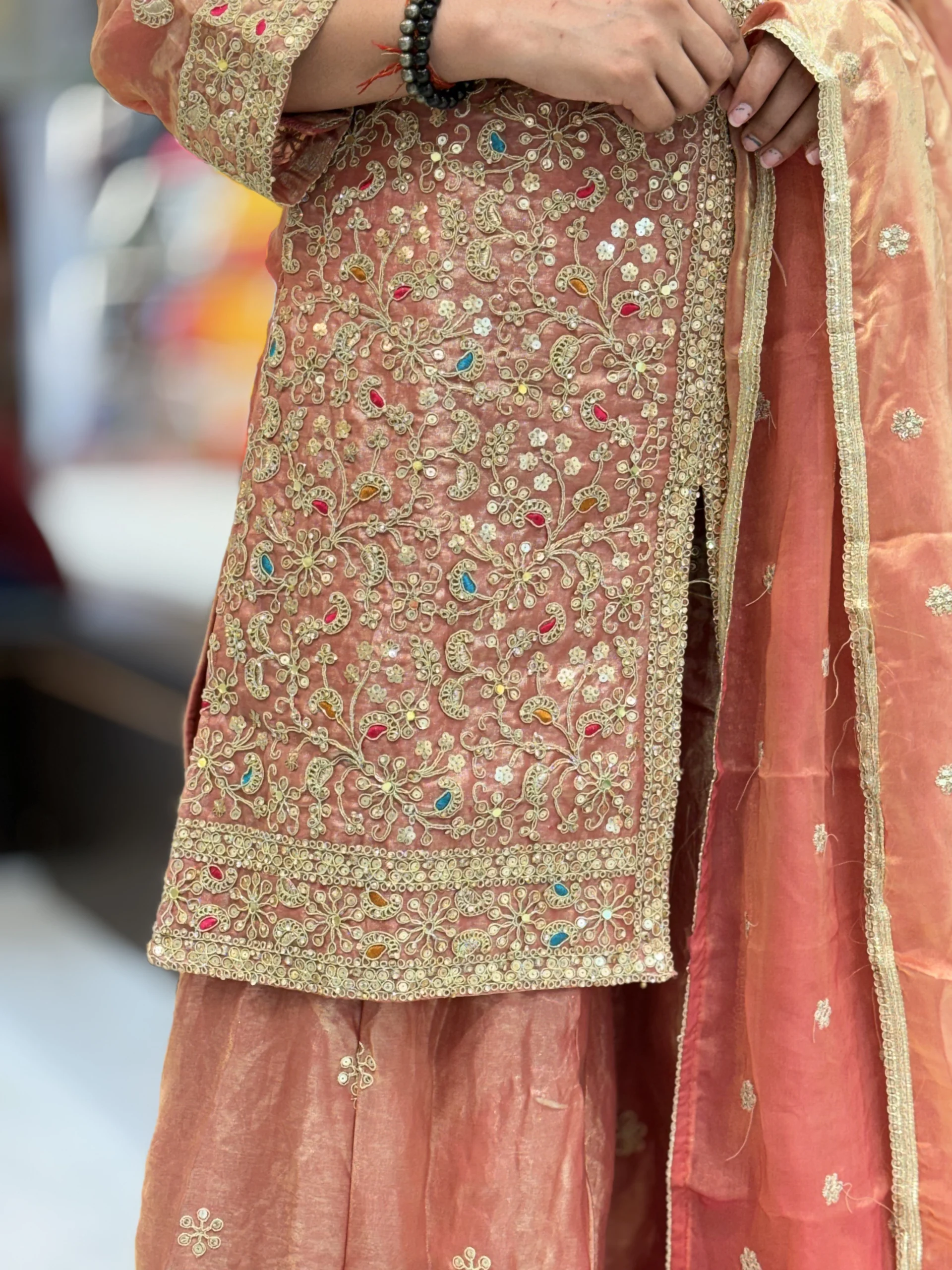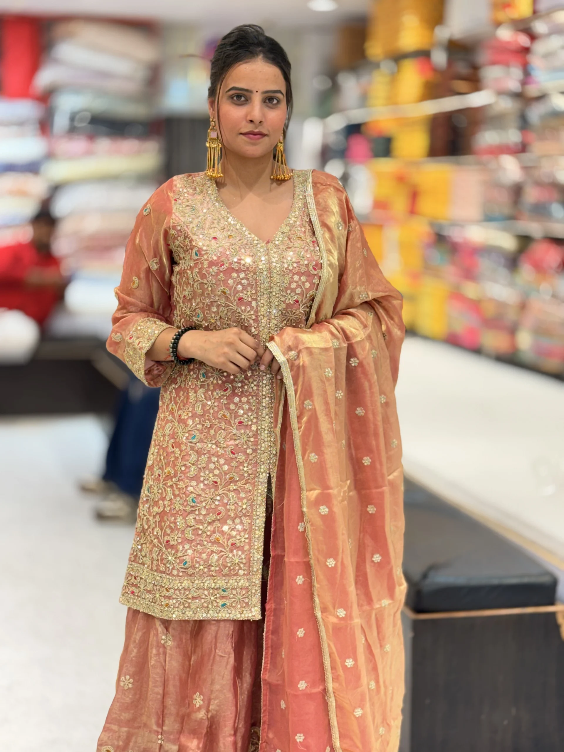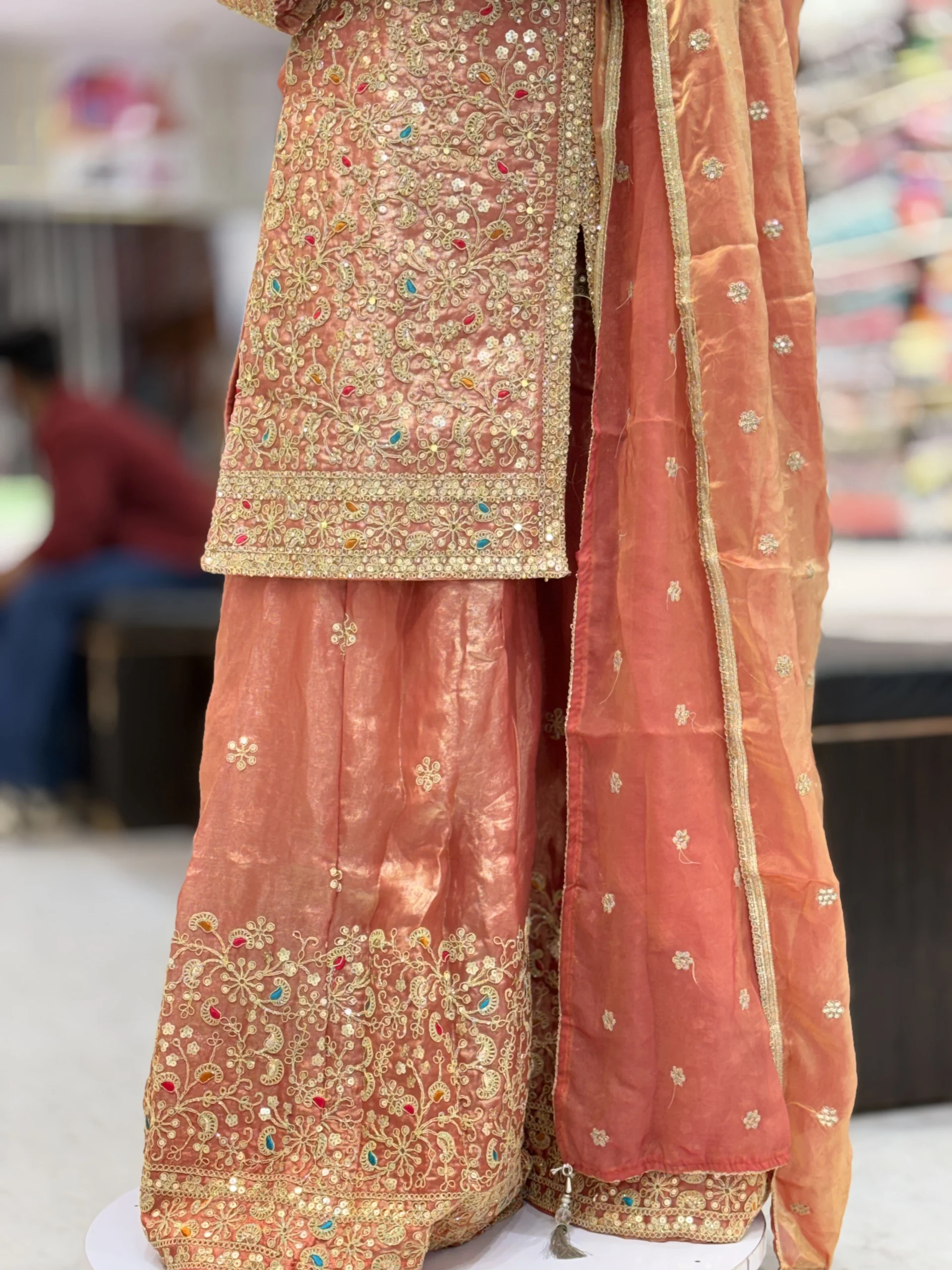 Brighten every celebration with the radiant charm of the Peach Embellished Suit. Designed in a soft peach hue, this stunning ensemble features exquisite embellishments that add richness, sparkle, and festive elegance.
