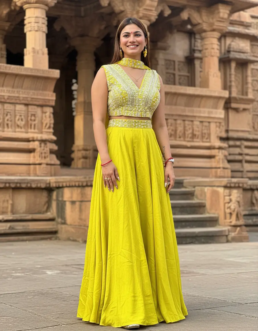 The contemporary design beautifully complements traditional craftsmanship, creating a silhouette that is both graceful and fashion-forward. Perfect for weddings, haldi ceremonies, festive gatherings, and special celebrations, this lehenga ensures you stand out with confidence and sophistication.